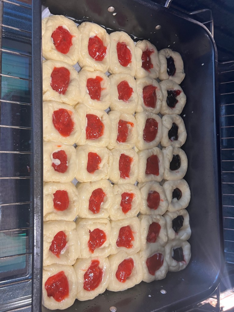 With a gentle press of my thumb, I create little wells in the center of each dough ball, ready to be filled with sweet delights. Raspberry jam, cream cheese, apricot preserves—the choices are endless, each one a nod to the flavors of my childhood.